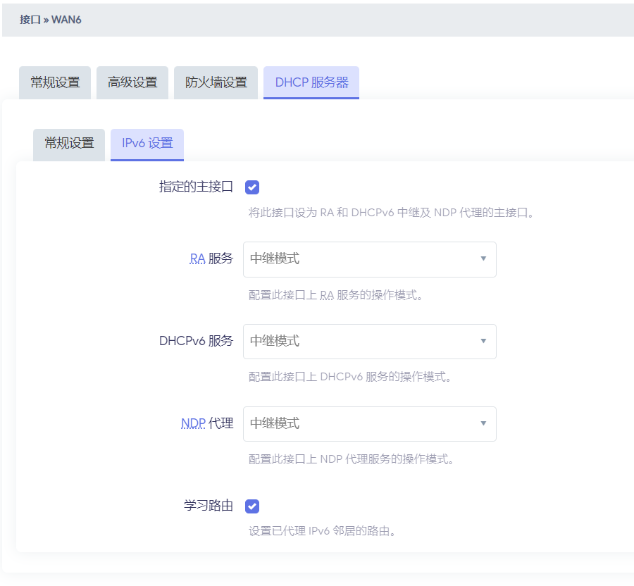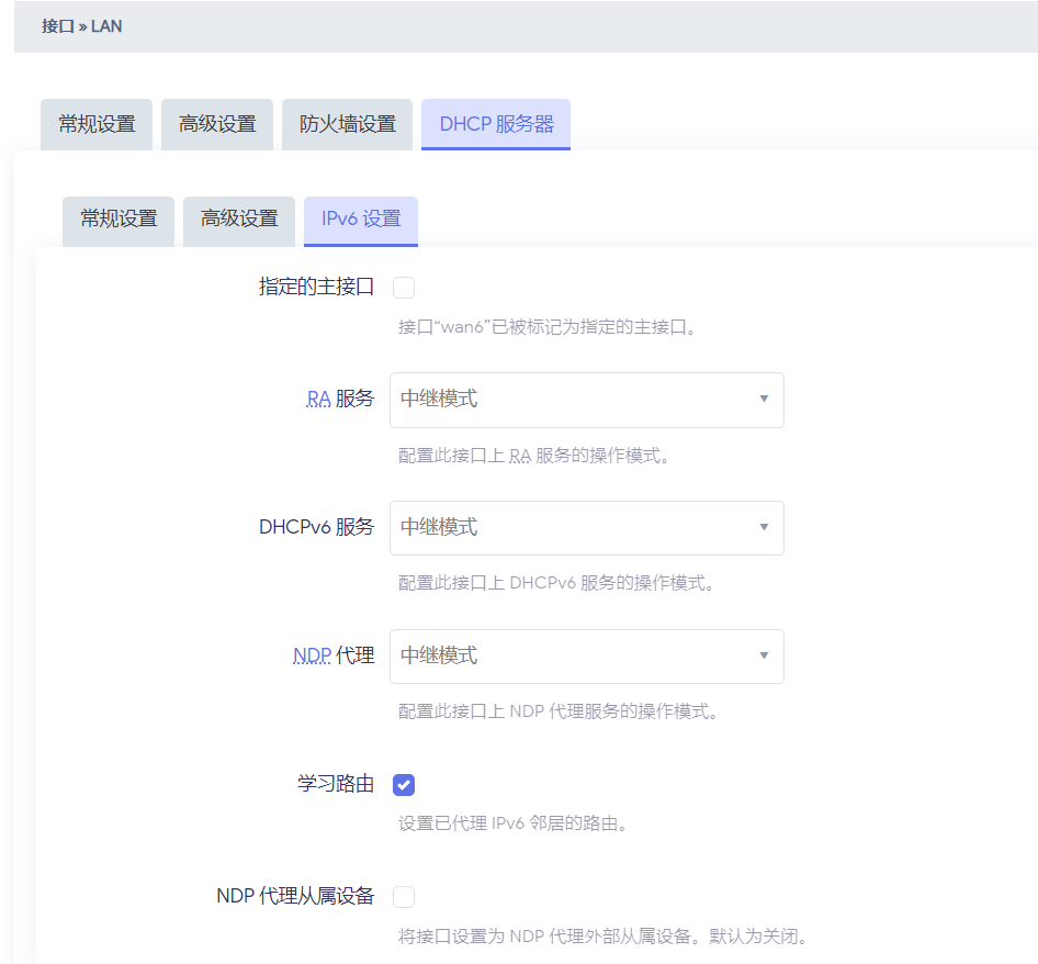 openwrt作为二级路由的ipv6设置 发表于 2022-05-24 更新于 2023-04-08 本文字数: 42 阅读时长 ≈ 1 分钟 LAN接口设置 12345678910config dhcp 'lan' option interface 'lan' option start '100' option limit '150' option leasetime '12h' option dhcpv4 'server' option ra 'relay' option dhcpv6 'relay' option ndp 'relay' list ra_flags 'none' WAN6接口设置 12345678config dhcp 'wan6' option interface 'wan6' option ignore '1' option ra 'relay' option dhcpv6 'relay' option ndp 'relay' option master '1' list ra_flags 'none' 然后openwrt下的设备就可以正常获取ipv6地址了
