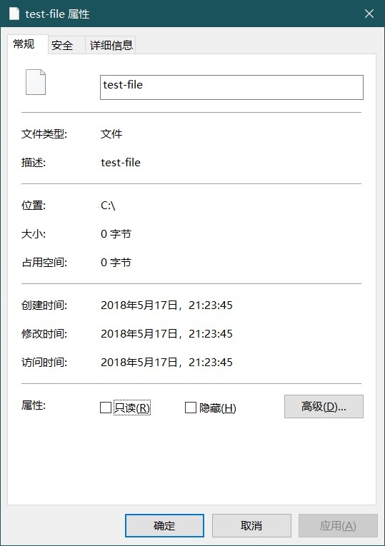 Windows修改文件时间属性 发表于 2022-05-26 更新于 2023-04-08 本文字数: 42 阅读时长 ≈ 1 分钟 Microsoft文档 创建文件 123456789PS C:\> New-Item test-file 目录: C:\Mode LastWriteTime Length Name---- ------------- ------ -----a---- 2022/5/26 16:50 0 test-file 显示文件的创建、最后修改、最后访问时间 12345678910111213PS C:\> (ls test-file).CreationTimeUtc2022年5月26日 8:50:31PS C:\> (ls test-file).LastAccessTimeUtc2022年5月26日 8:50:31PS C:\> (ls test-file).LastWriteTimeUtc2022年5月26日 8:50:31 修改文件时间属性 123PS C:\> (ls test-file).CreationTimeUtc="2018-05-17 13:23:45"PS C:\> (ls test-file).LastWriteTimeUtc="2018-05-17 13:23:45"PS C:\> (ls test-file).LastAccessTimeUtc="2018-05-17 13:23:45"